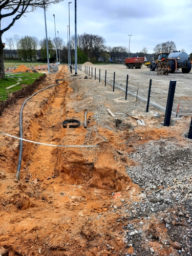 Die Arbeiten kommen gut voran! Published by Svetislav Stefanovic 12. April 2021 Trotz des teilweise sehr schlechten Wetters (der April macht was er will 😉 ), sind die Bauarbeiten auf der Platzanlage voll im Soll. Die Pflasterung am Ballfang ist fertig, auch wurde die neue LED Flutlichtanlage auf den Masten installiert.