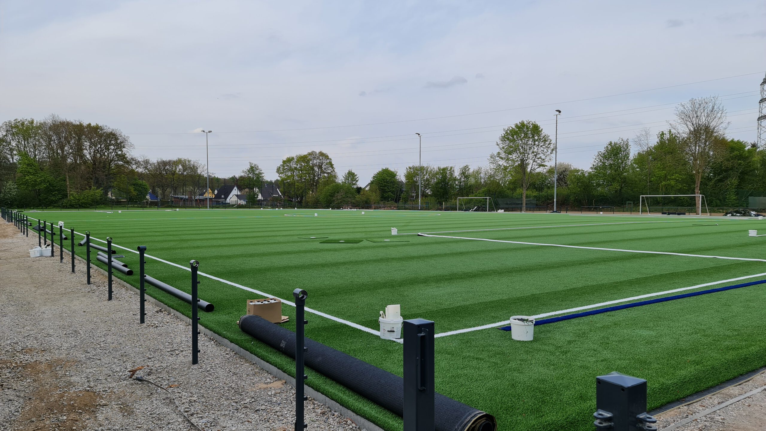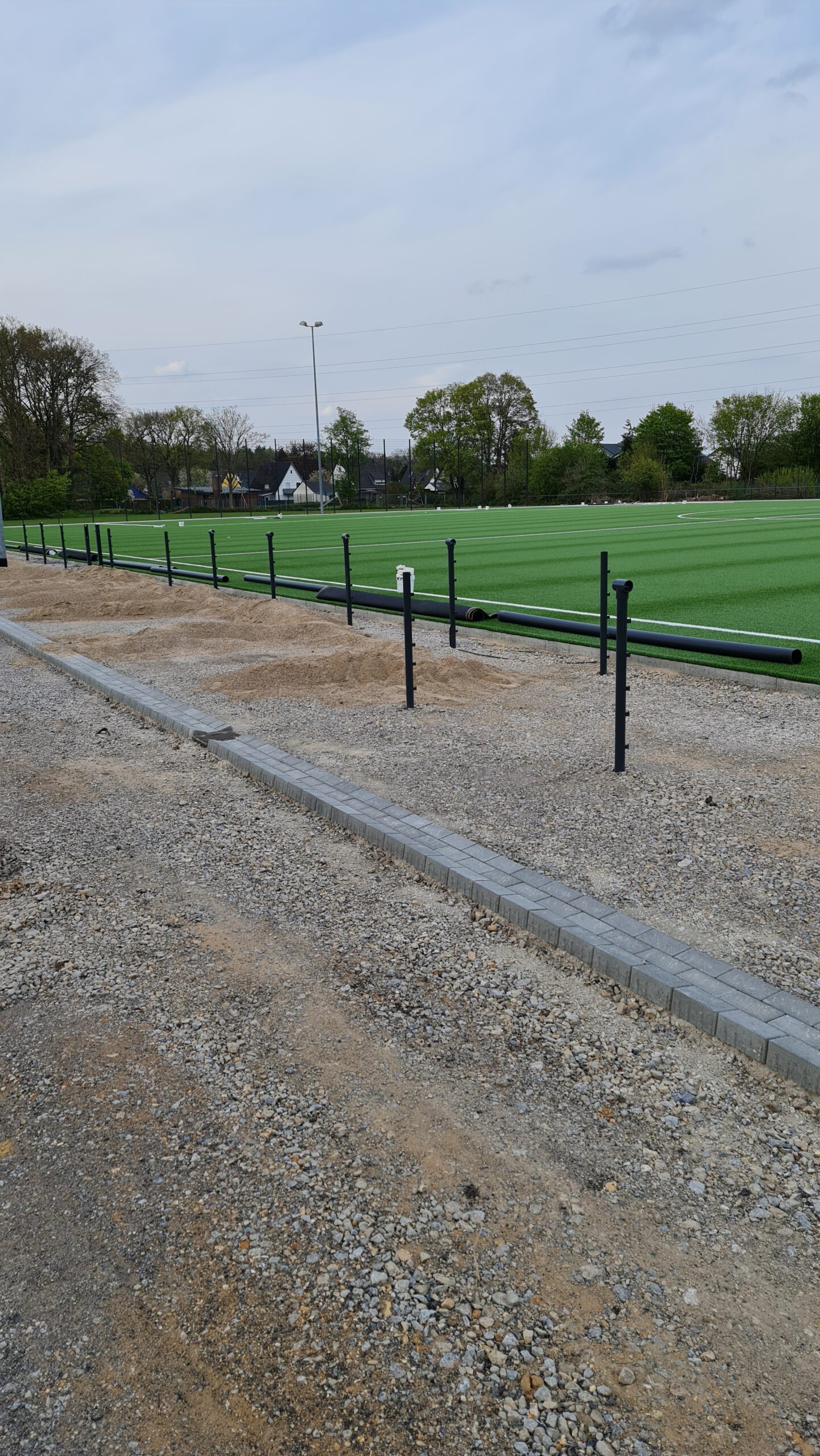 Wir befinden uns auf der Zielgeraden! Nachdem in den letzten beiden Wochen die sogenannte ET-Schicht aufgetragen wurde, stehen nun auch schon die Arbeiten am neuen grünen Spieluntergrund kurz vorm Abschluss. Parallel dazu, werden in dieser Woche die letzten Pflastersteine gelegt. Die neuen Spielerbänke sind angeliefert worden und stehen bereit, aufgestellt zu werden.