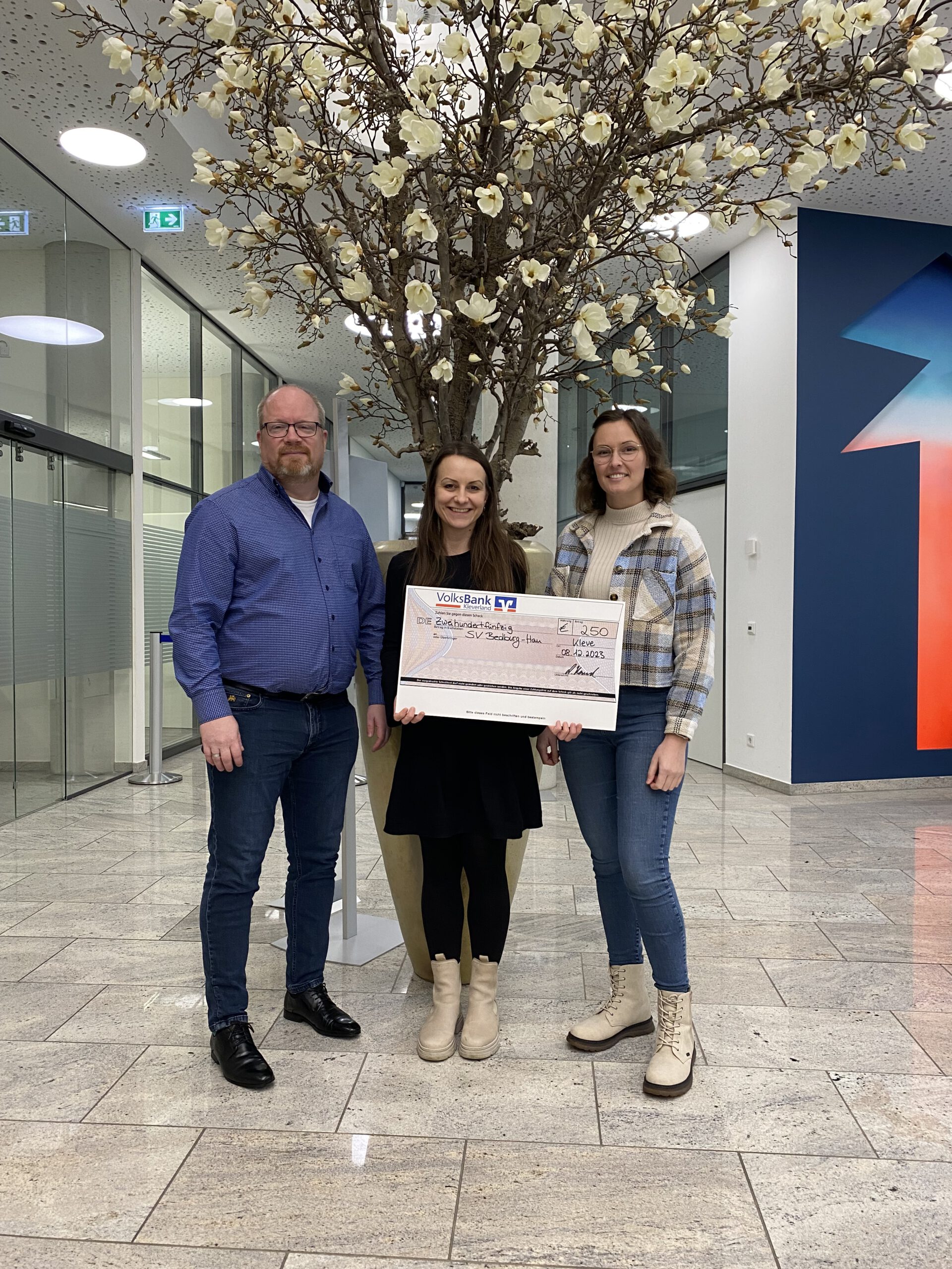 Anlässlich des 100-jährigen Vereinsbestehens der Sportvereinigung 1923/27 e.V. Bedburg-Hau, überreichte die Volksbank Kleverland, vertreten durch Frau Linda Kawalleck, unserem Vereinsvorsitzenden Sascha Wilmsen und unserer stellvertretenden Kassiererin Hanna Ripkens, einen Glückwunsch-Scheck in Höhe von 250,– €.
